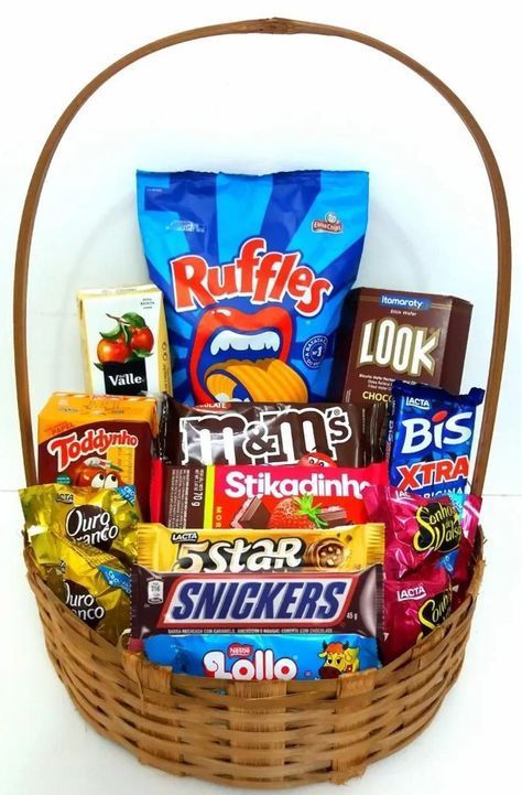 Essa cesta é um mix bem completo de doces, chocolates e snacks salgados. Nela você encontra: